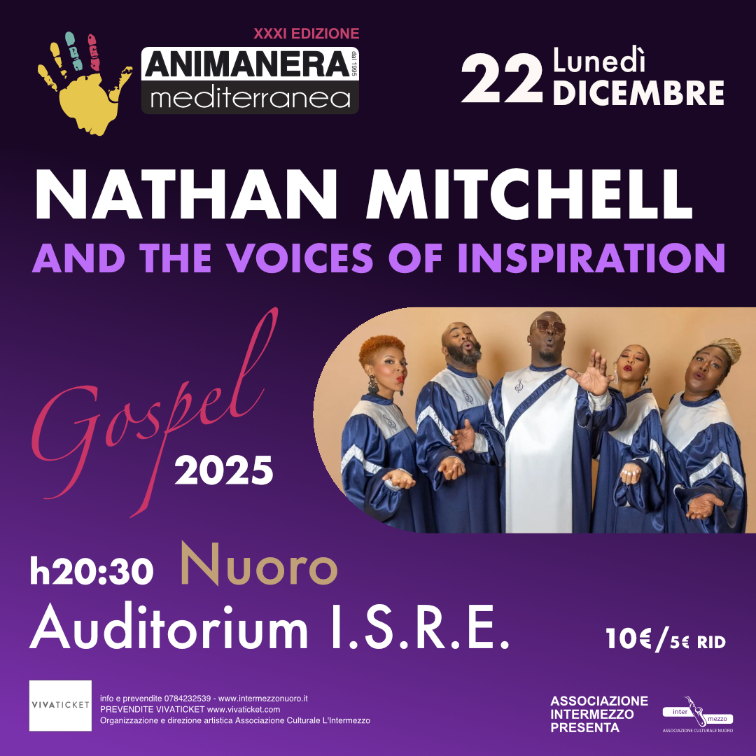 Come da tradizione, Animanera Mediterranea culminerà nel suo appuntamento Gospel, che dal 19 al 27 dicembre porterà in giro per le strade di Orani, Dorgali, Nuoro e Lula due formazioni d’eccezione: Nathan Mitchell and the Voices of Inspiration, ensemble guidato dal poliedrico musicista statunitense e produttore jazz-soul, e il Florida Fellowship Super Choir, vincitore del concorso “How Sweet the Sound” e oggi tra i cori più acclamati degli Stati Uniti.