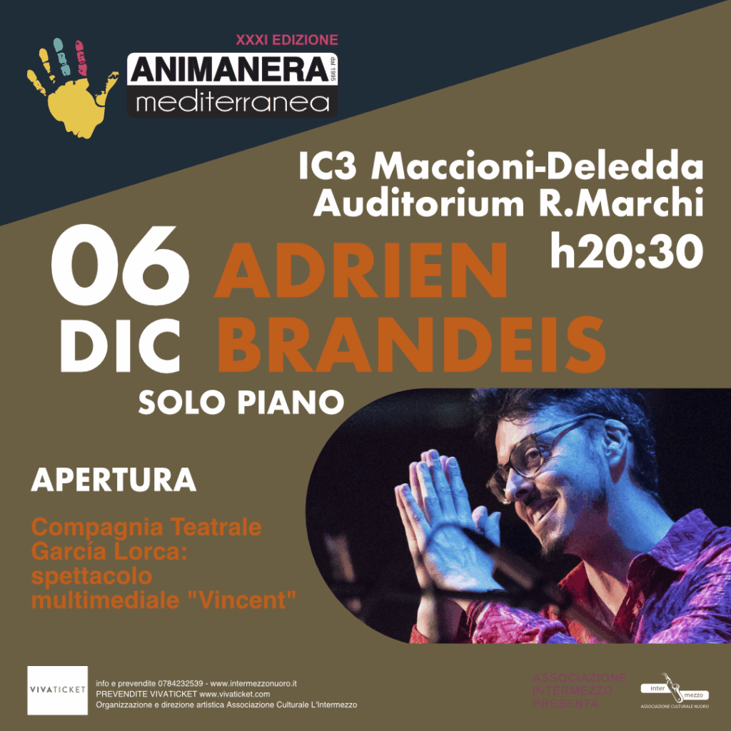 Sabato 6 dicembre – Auditorium Marchi Nuoro, ore 20.30 Adrien Brandeis Compagnia Teatrale García Lorca. Il pianista e compositore francese Adrien Brandeis, vincitore del Letter One Rising Stars Jazz Award e protagonista dei più importanti festival jazz internazionali, presenta un concerto in piano di ampio respiro melodico e contemporaneo.