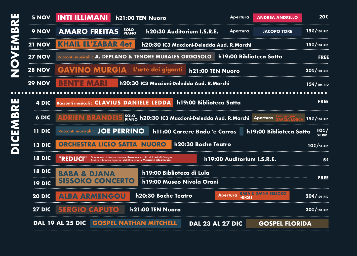 Tra i momenti più intensi, l’11 dicembre il rocker cagliaritano Joe Perrino porterà i suoi Racconti musicali in due luoghi simbolo della città – il carcere di Badu ’e Carros e la Biblioteca Satta, mentre il 13 dicembre il Boche Teatro ospiterà l’Orchestra del Liceo Satta  di Nuoro.